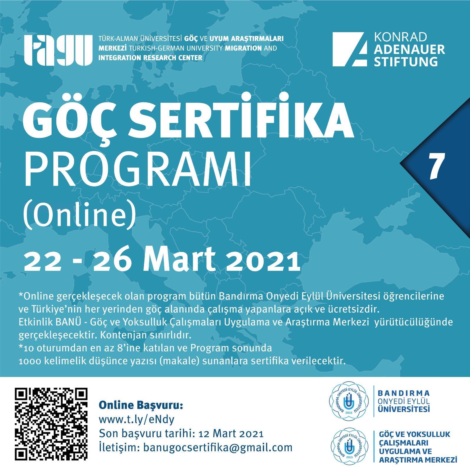 Üniversitemiz, Türk Alman Üniversitesi, Konrad Adenauer Stiftung (KAS) Türkiye işbirliği ve Üniversitemiz ev sahipliğinde “Göç Sertifika Programı” düzenlenecektir. Üniversitemiz Göç ve Yoksulluk Çalışmaları Uygulama ve Araştırma Merkezi, Türk Alman Üniversitesi Göç ve Uyum Araştırmaları Merkezi (TAGU) ve KAS Türkiye tarafından organize edilen, 22-26 Mart tarihleri arasında çevrimiçi gerçekleşecek olan programa Üniversitemiz öğrencileri ve göç alanında çalışma yapan herkes katılım sağlayabilecektir. Katılım sayısının kontenjanla sınırlı olduğu program hakkında detaylı bilgi almak ve programa başvuru yapmak için www.t.ly/eNdy adresini ziyaret edebilirsiniz.